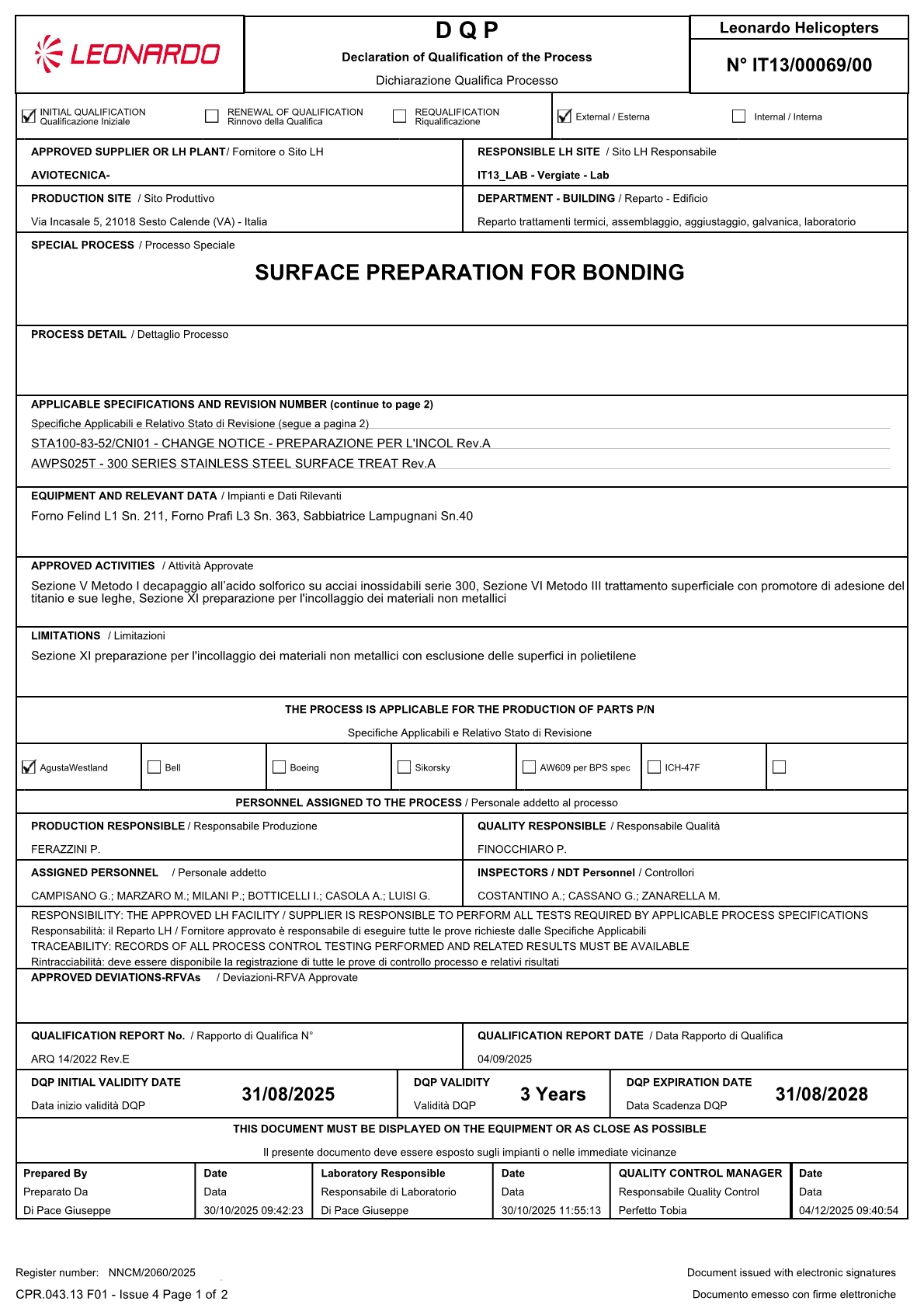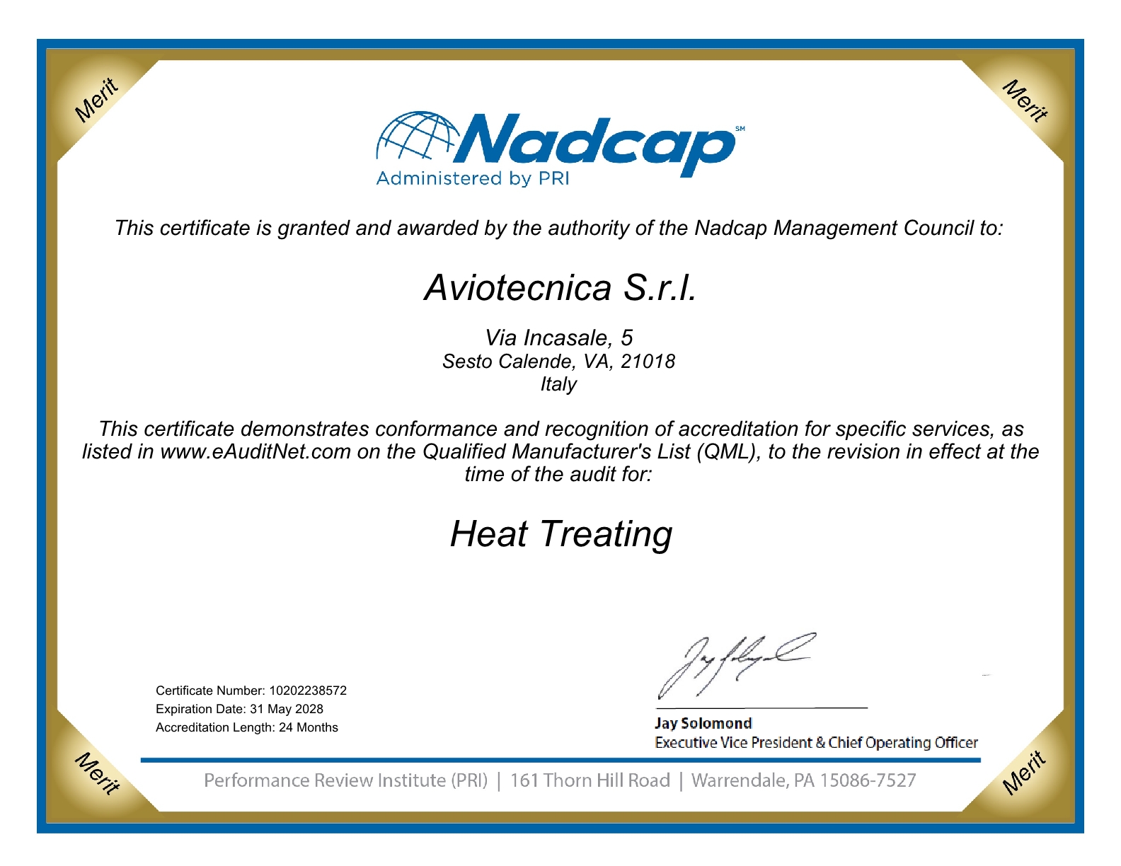 Aviotecnica S.r.l. è certificata Part 21G da Enac, EN ISO 9100:2018 da DNV e Nadcap per i processi speciali. I processi di lavorazione e le procedure di controllo sono, pertanto, qualificati e certificati dai principali clienti aeronautici con i quali collaboriamo: Leonardo-Finmeccanica Aircraft, Leonardo-Finmeccanica Helicopters, Boeing, Microtecnica S.r.l. – una società di UTC Aerospace Systems – Aerea S.p.A., Actuation and Landing System Division – una società di Mecaer Aviation Group S.p.A.