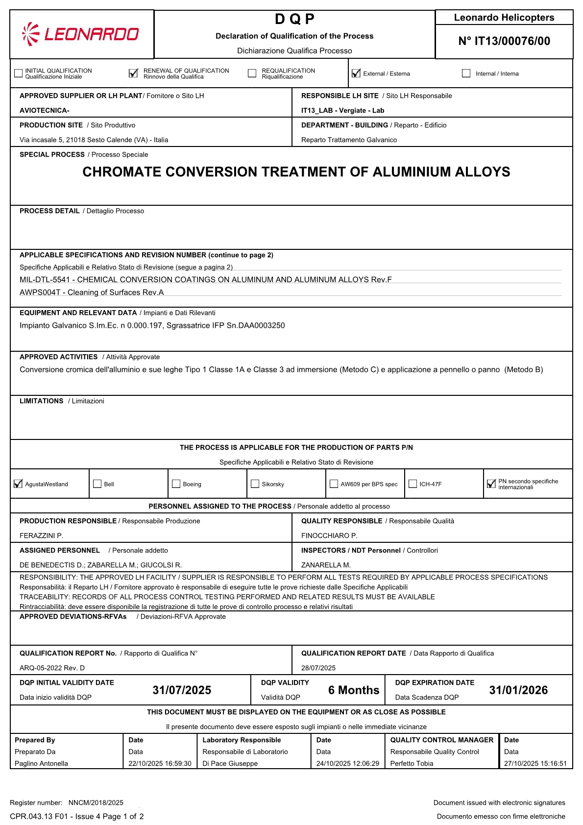 Ossidazione anodica all’acido cromico dell’alluminio e delle sue leghe Tipo 1C Classe 2 e Tipo 2C Classe 2.